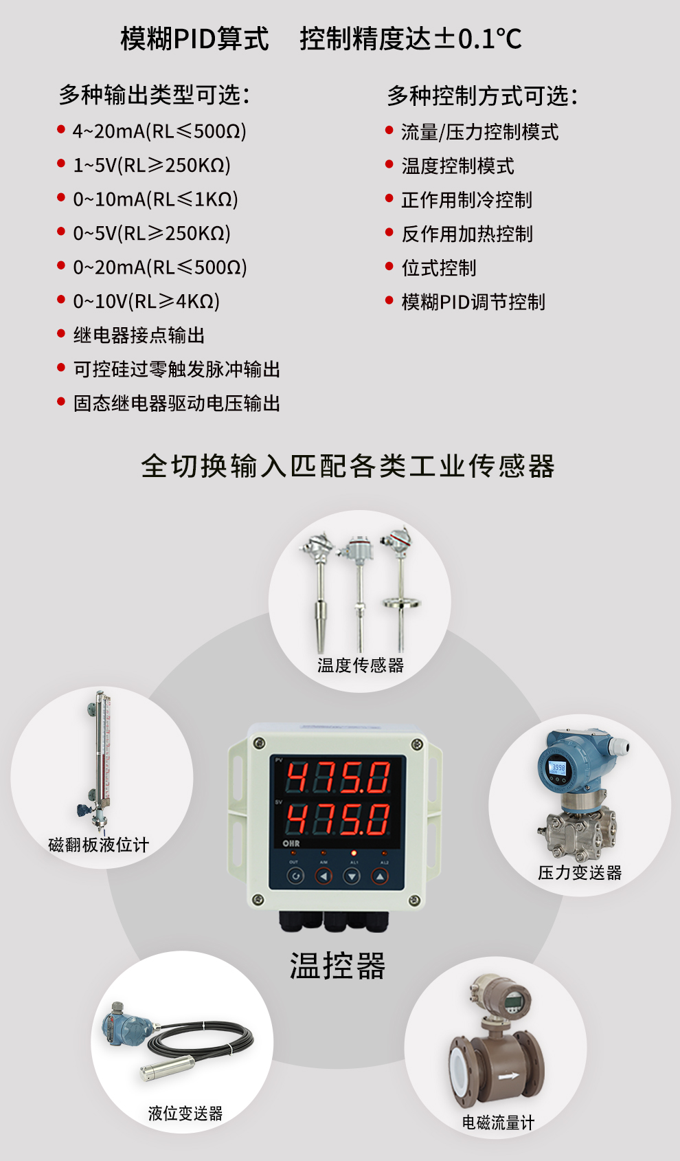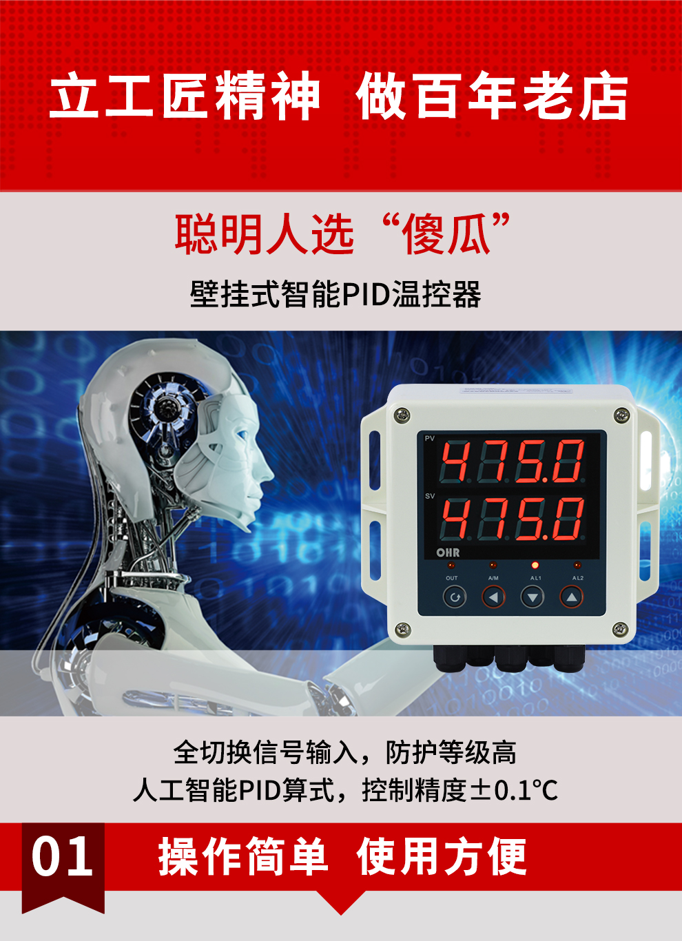 虹潤(rùn)公司是專業(yè)生產(chǎn)溫控器的國(guó)家專精特新“小巨人”企業(yè)。生產(chǎn)的壁掛式PID溫控器,具有全切換信號(hào)輸入,真正人工智能算式,控制精度達(dá)士0.1°C,防護(hù)等級(jí)高,RS485通訊輸出DN等特點(diǎn)。產(chǎn)品獲得模糊PID控制儀及控制方法、人工智能調(diào)節(jié)器、智能化控制器、移相觸發(fā)控制器、閥門自動(dòng)手動(dòng)無(wú)擾動(dòng)操作控制方法及裝置等5項(xiàng)國(guó)家發(fā)明專利,主持起草主持起草工業(yè)過程控制系統(tǒng)用模擬輸入兩位或多位輸出儀表、物聯(lián)網(wǎng)智能溫度儀表通用技術(shù)條件、工業(yè)過程測(cè)量和控制系統(tǒng)用智能調(diào)節(jié)器等3項(xiàng)國(guó)家標(biāo)準(zhǔn),以及通信系統(tǒng)多通道數(shù)據(jù)采集控制終端規(guī)范軍用標(biāo)準(zhǔn)。參與國(guó)際5G標(biāo)準(zhǔn)制定,取得傻瓜式PID調(diào)節(jié)儀等3項(xiàng)相關(guān)軟件著作權(quán)。產(chǎn)品廣泛應(yīng)用于電力、石化,冶金、制藥、食品等幾乎所有工業(yè)現(xiàn)場(chǎng),實(shí)現(xiàn)精準(zhǔn)控溫,保障生產(chǎn)安全與質(zhì)量。