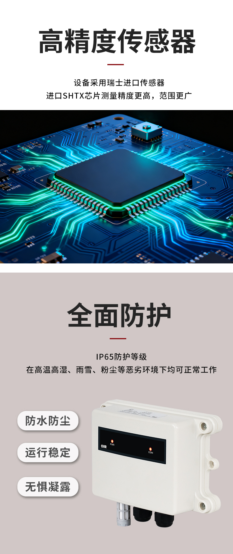 虹潤公司是專業(yè)生產(chǎn)環(huán)境監(jiān)測儀表的國家專精特新“小巨人”企業(yè)。生產(chǎn)的一體式溫濕度變送器,具有溫度、濕度、露點高精準的測量與變送,報警繼電器輸出,RS485/RS232通訊,IP65防護等級等特點。產(chǎn)品獲得一種手持式低功耗溫濕度檢測儀、大屏幕溫濕度記錄儀等2項國家發(fā)明專利,主持起草物聯(lián)網(wǎng)智能溫度儀表通用技術(shù)條件、冷鏈溫度記錄儀等2項國家標準,以及通信系統(tǒng)多通道數(shù)據(jù)采集控制終端規(guī)范軍用標準,以及現(xiàn)場設(shè)備集成等5項智能制造國家標準,參與國際5G標準制定,取得溫濕度儀表等3項相關(guān)軟件著作權(quán)。產(chǎn)品廣泛應(yīng)用于工業(yè)現(xiàn)場、農(nóng)業(yè)大棚、倉儲物流、地下管廊、養(yǎng)殖孵化、配電機房等諸多領(lǐng)域。