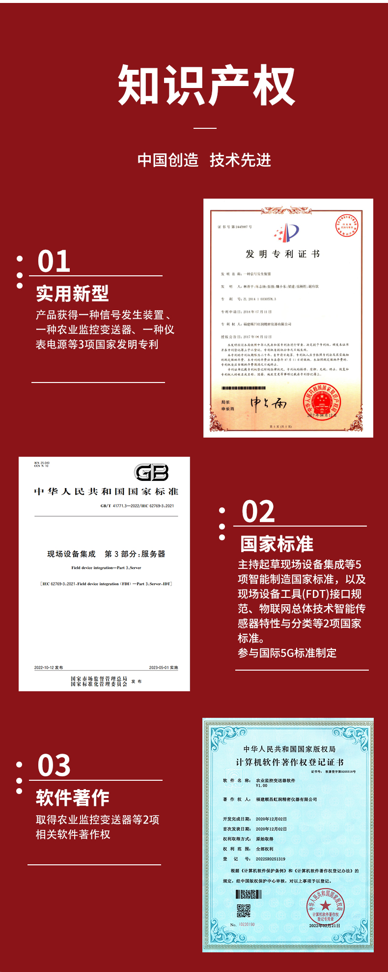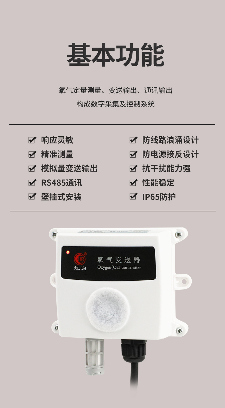 虹潤(rùn)公司是專業(yè)生產(chǎn)環(huán)境監(jiān)測(cè)儀表的國(guó)家專精特新“小巨人”企業(yè)。生產(chǎn)的氧氣變送器,具有采用電化學(xué)原理,響應(yīng)靈敏,準(zhǔn)確度高,低功耗,模擬量變送輸出或RS485通訊等特點(diǎn)。產(chǎn)品獲得一種農(nóng)業(yè)監(jiān)控變送器、一種儀表電源等2項(xiàng)實(shí)用新型專利,主持起草現(xiàn)場(chǎng)設(shè)備集成等5項(xiàng)智能制造國(guó)家標(biāo)準(zhǔn),以及現(xiàn)場(chǎng)設(shè)備工具(FDT)接口規(guī)范、物聯(lián)網(wǎng)總體技術(shù)智能傳感器特性與分類等2項(xiàng)國(guó)家標(biāo)準(zhǔn),參與國(guó)際5G標(biāo)準(zhǔn)制定,取得農(nóng)業(yè)監(jiān)控變送器等3項(xiàng)相關(guān)軟件著作權(quán)。產(chǎn)品廣泛應(yīng)用于機(jī)房、配電站、地下車庫(kù)、工廠倉(cāng)庫(kù)、食品儲(chǔ)存、養(yǎng)殖場(chǎng)、果蔬林園等環(huán)境場(chǎng)合對(duì)氧氣濃度的檢測(cè)。