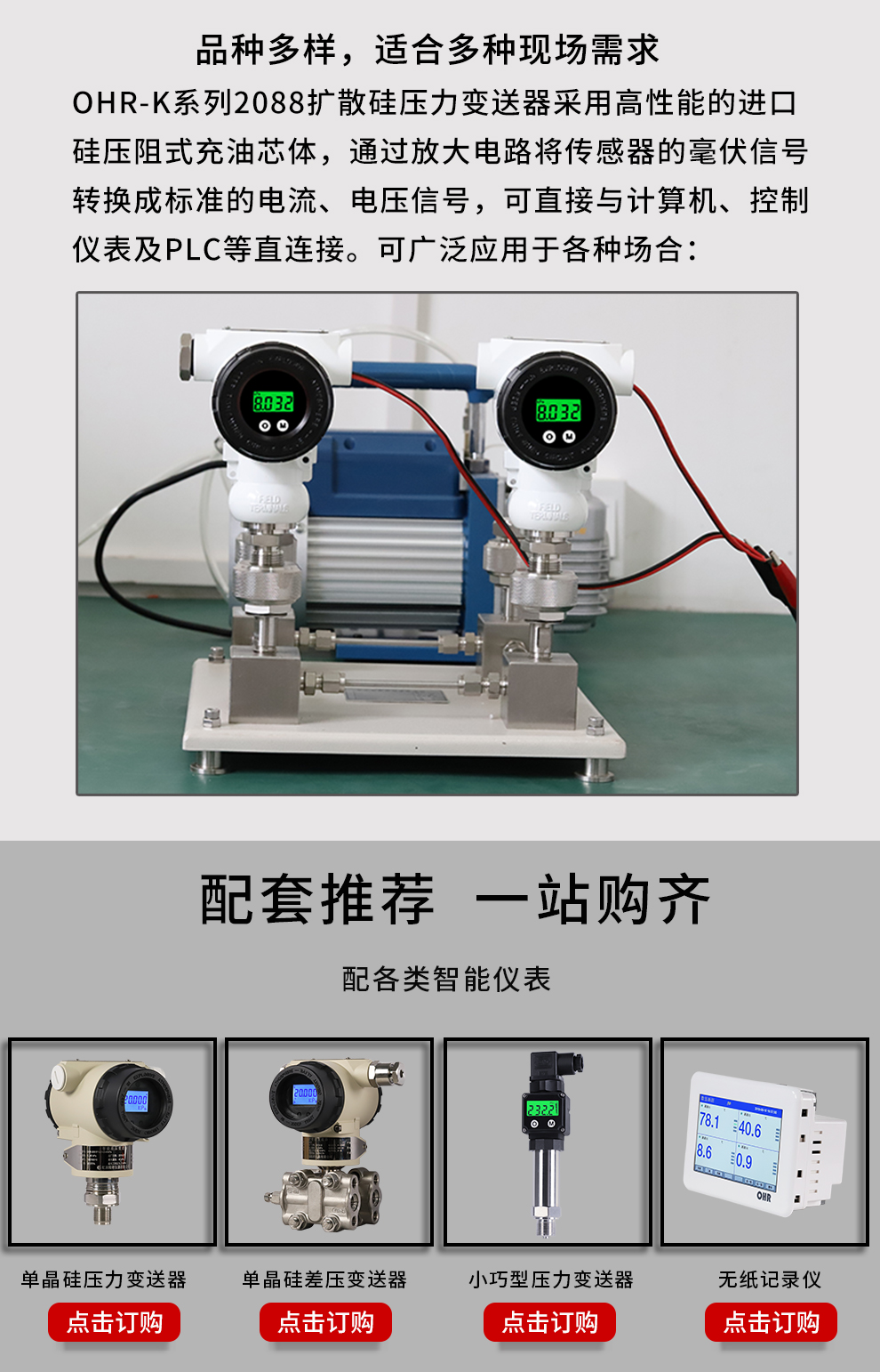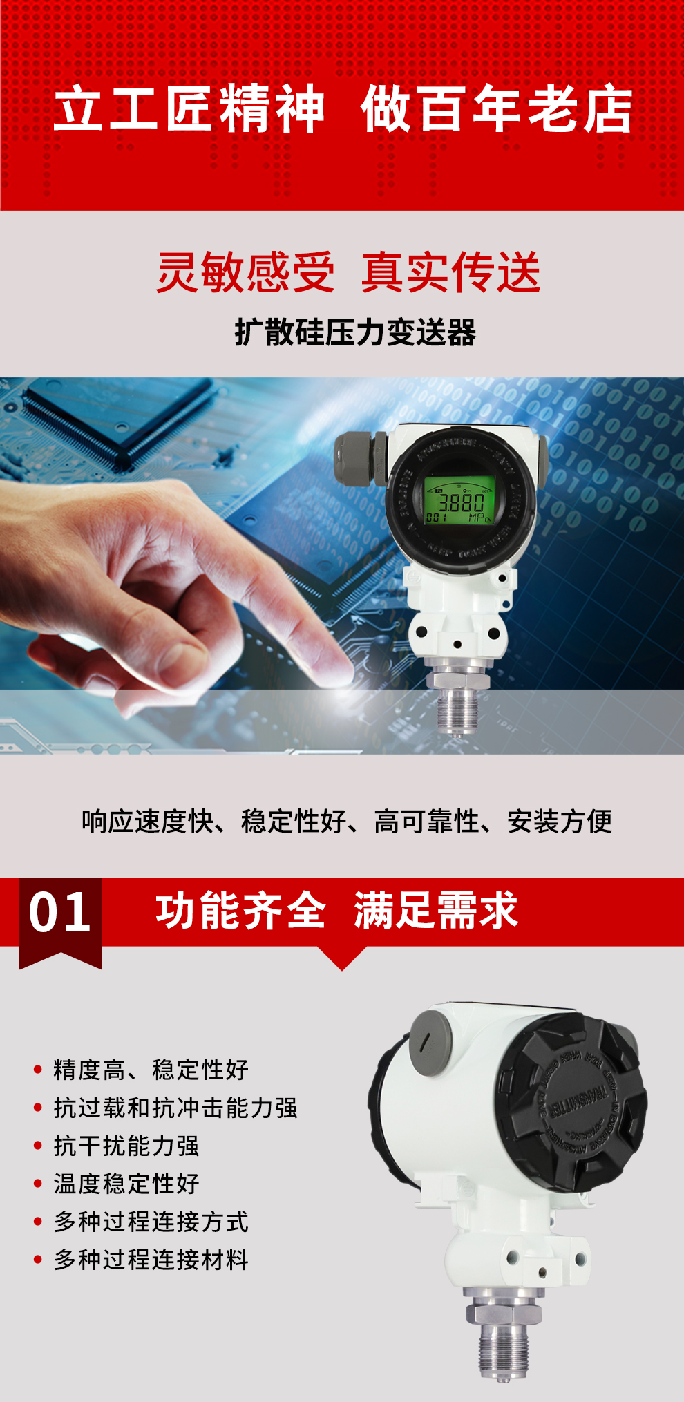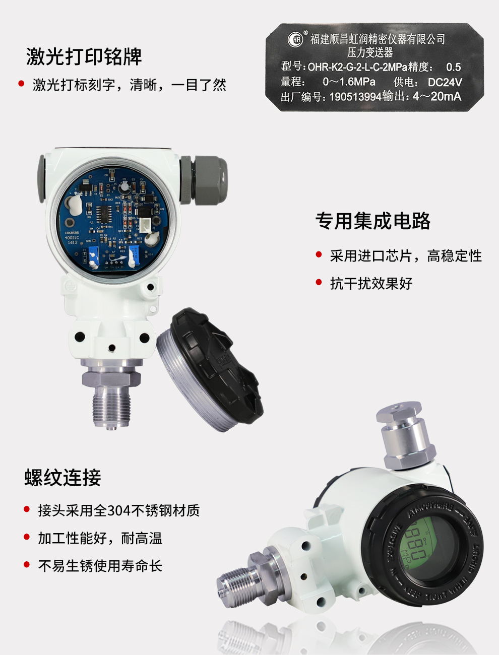虹潤(rùn)公司是專(zhuān)業(yè)生產(chǎn)壓力變送器的國(guó)家專(zhuān)精特新“小巨人”企業(yè),生產(chǎn)的擴(kuò)散硅壓力變送器,具有精度高,穩(wěn)定性好,響應(yīng)速度快,高可靠性,抗過(guò)載和抗沖擊能力強(qiáng),安裝方便等特點(diǎn)。產(chǎn)品獲得一種數(shù)字顯示低功耗壓力表、一種信號(hào)發(fā)生器裝置等2項(xiàng)國(guó)家發(fā)明專(zhuān)利,主持起草工業(yè)過(guò)程控制系統(tǒng)用模擬輸入兩位或多位輸出儀表、工業(yè)過(guò)程測(cè)量和控制系統(tǒng)用壓力/差壓變送器等2項(xiàng)國(guó)家標(biāo)準(zhǔn),通信系統(tǒng)多通道數(shù)據(jù)采集控制終端規(guī)范軍用標(biāo)準(zhǔn),以及現(xiàn)場(chǎng)設(shè)備集成等5項(xiàng)智能制造國(guó)家標(biāo)準(zhǔn)。參與國(guó)際5G標(biāo)準(zhǔn)制定,取得數(shù)顯壓力表等2項(xiàng)相關(guān)軟件著作權(quán)。產(chǎn)品廣泛應(yīng)用于化工、食品、制藥、電力、設(shè)備配套、供暖、水處理、樓宇等行業(yè),需精準(zhǔn)測(cè)量流體壓力的現(xiàn)場(chǎng)。