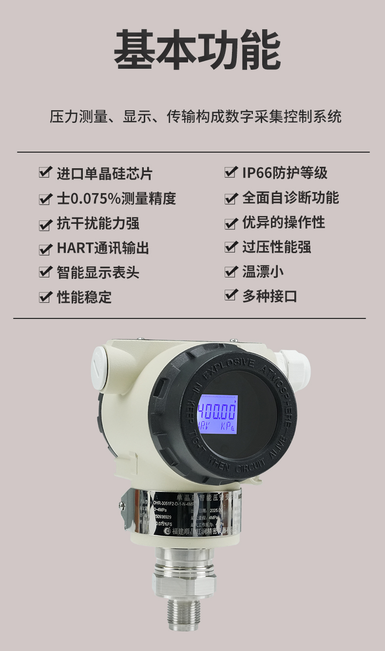 虹潤公司是專業(yè)生產壓力變送器的國家專精特新“小巨人”企業(yè),生產的單晶硅壓力變送器,具有高精度,小溫漂,性能穩(wěn)定,帶HART通訊,抗干擾能力強,自診斷功能等特點。產品獲得一種數(shù)字顯示低功耗壓力表、一種信號發(fā)生器裝置等2項國家發(fā)明專利,主持起草工業(yè)過程控制系統(tǒng)用模擬輸入兩位或多位輸出儀表、工業(yè)過程測量和控制系統(tǒng)用壓力/差壓變送器等2項國家標準,通信系統(tǒng)多通道數(shù)據(jù)采集控制終端規(guī)范軍用標準,以及現(xiàn)場設備集成等5項智能制造國家標準。參與國際5G標準制定,取得數(shù)顯壓力表等2項相關軟件著作權。產品廣泛應用于化工、食品、制藥、電力、設備配套、供暖、水處理、樓宇等行業(yè),需精準測量流體壓力的現(xiàn)場。