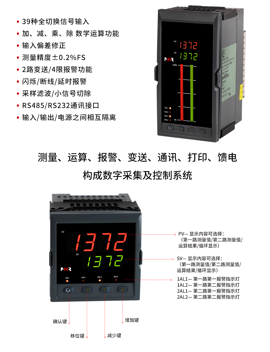 虹潤公司是專業(yè)生產(chǎn)數(shù)顯表的國家專精特新“小巨人”企業(yè),生產(chǎn)的智能雙路數(shù)顯儀表,具有全切換信號輸入,加減乘除數(shù)學(xué)運(yùn)算,高抗干擾,過壓過流保護(hù),RS485/RS232通訊等特點。產(chǎn)品獲得巡回檢測顯示方法及裝置、儀表殼體等2項國家發(fā)明專利,主持起草工業(yè)過程控制系統(tǒng)用模擬輸入兩位或多位輸出儀表、物聯(lián)網(wǎng)智能溫度儀表通用技術(shù)條件等2項國家標(biāo)準(zhǔn),,以及通信系統(tǒng)多通道數(shù)據(jù)采集控制終端規(guī)范軍用標(biāo)準(zhǔn),參與國際5G標(biāo)準(zhǔn)制定,取得雙回路數(shù)字顯示控制儀表等3項相關(guān)軟件著作權(quán)。產(chǎn)品廣泛應(yīng)用于電力、石化、冶金、化工、造紙、食品、輕工、制藥、熱處理、水處理、機(jī)械配套等各種工業(yè)現(xiàn)場。