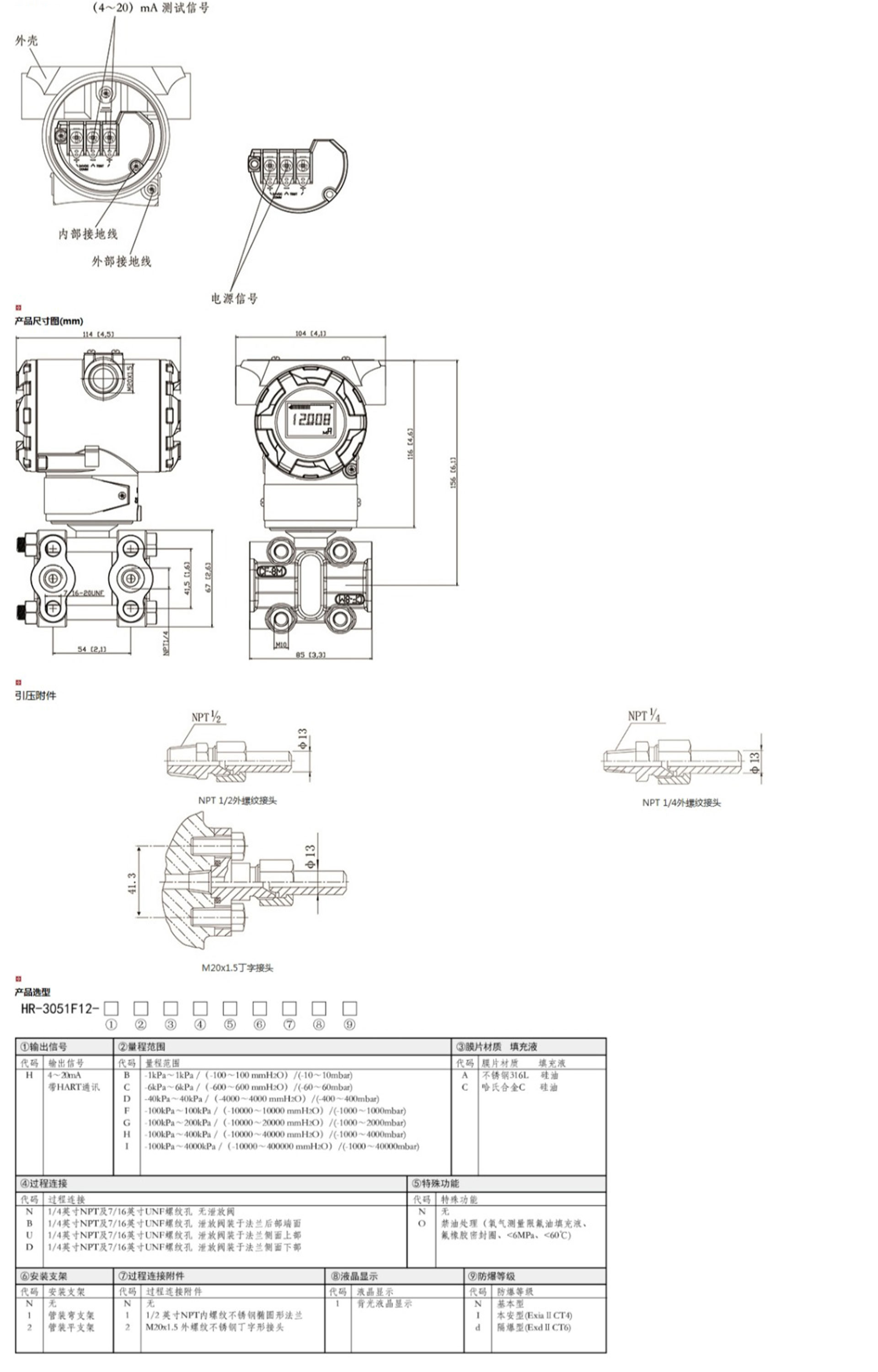HR-3051F12智能單晶硅夾板式壓力變送器能準確的測量壓力,并把它轉換成4~20mADC的輸出信號。該變送器可通過三按鍵本地操作,或通用手操器、組態(tài)軟件、以及手機APP遠程操作,在不影響4~20mA DC的輸出信號的同時,進行顯示與組態(tài)。