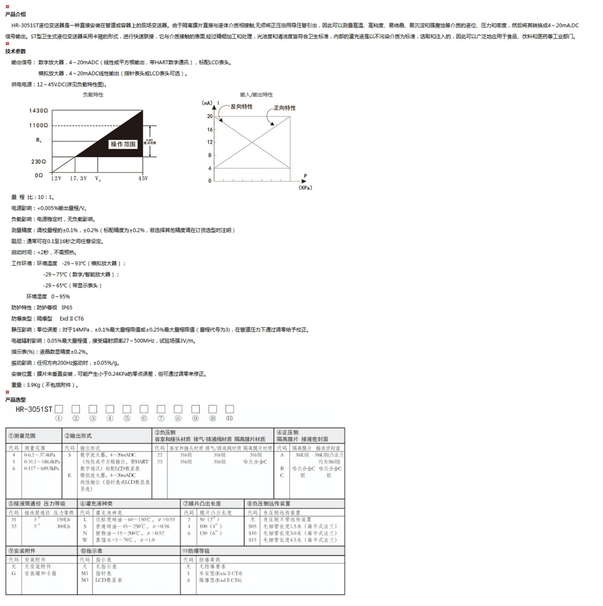 HR-3051ST液位變送器是一種直接安裝在管道或容器上的現(xiàn)場變送器。由于隔離膜片直接與液體介質(zhì)相接觸,無須將正壓側用導壓管引出,因此可以測量高溫、高粘度、易結晶、易沉淀和強腐蝕等介質(zhì)的液位、壓力和密度,然后將其轉換成4~20mA.DC信號輸出。