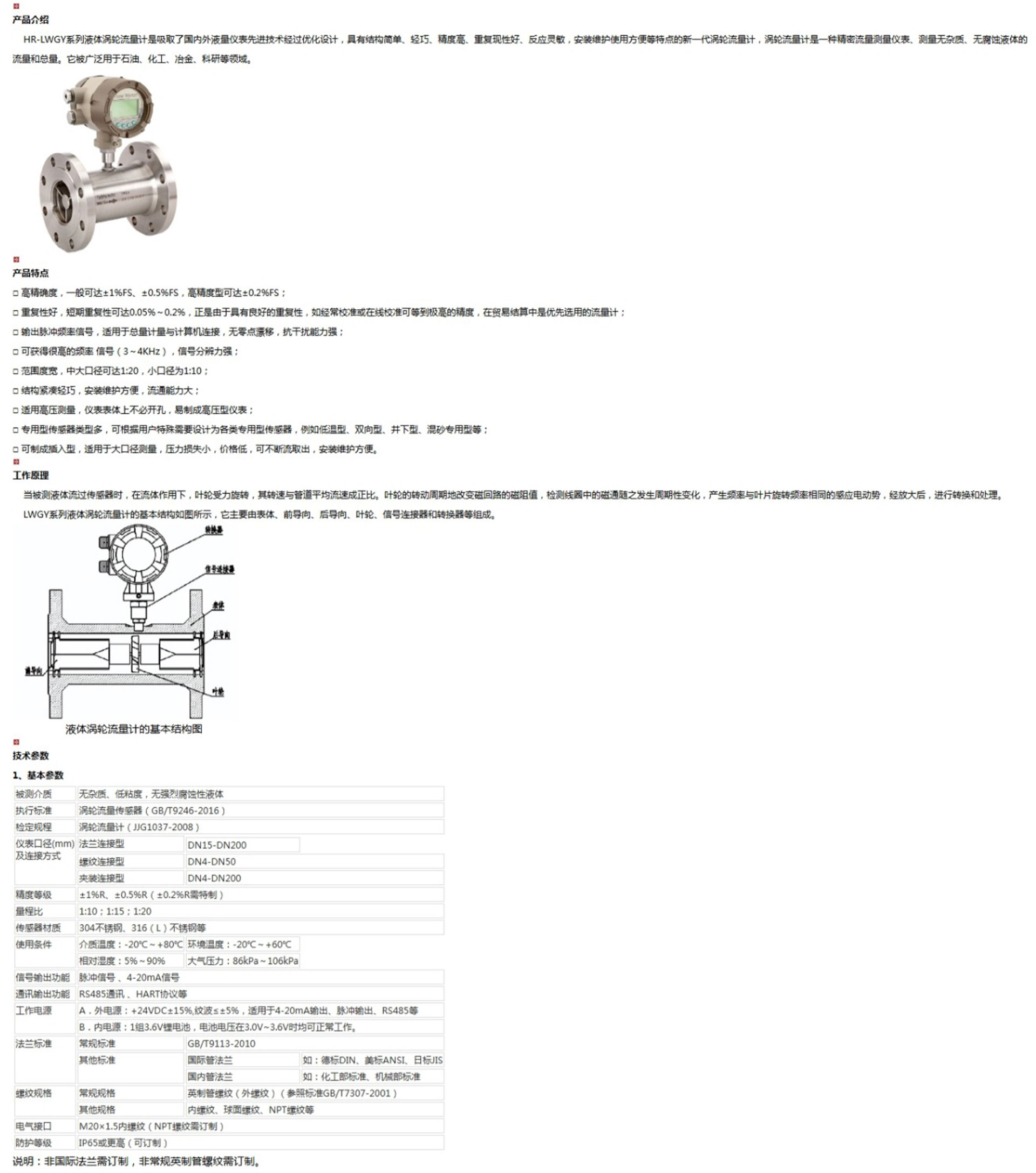 HR-LWGY系列液體渦輪流量計是吸取了國內(nèi)外液量儀表先進技術(shù)經(jīng)過優(yōu)化設計,具有結(jié)構(gòu)簡單、輕巧、精度高、重復現(xiàn)性好、反應靈敏,安裝維護使用方便等特點的新一代渦輪流量計,渦輪流量計是一種精密流量測量儀表、測量無雜質(zhì)、無腐蝕液體的流量和總量。它被廣泛用于石油、化工、冶金、科研等領域。
