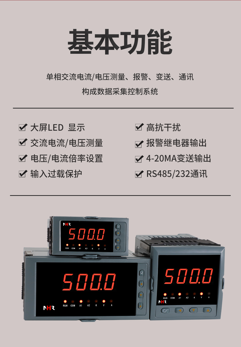 虹潤(rùn)公司是專業(yè)生產(chǎn)數(shù)字電壓表的國(guó)家專精特新“小巨人”企業(yè),生產(chǎn)的交流電壓/電流表,具有大屏LED顯示,電流電壓倍率設(shè)置,高抗干擾,輸出過載保護(hù),RS485/RS232通訊等特點(diǎn)。產(chǎn)品獲得一種交流信號(hào)變送器、交直流信號(hào)轉(zhuǎn)換電路、基于DCS技術(shù)的盤裝式三相電量表等3項(xiàng)國(guó)家發(fā)明專利,主持起草工業(yè)過程控制系統(tǒng)用模擬輸入兩位或多位輸出儀表國(guó)家標(biāo)準(zhǔn),直流漏電流傳感器規(guī)范、通信系統(tǒng)多通道數(shù)據(jù)采集控制終端規(guī)范等2項(xiàng)軍用標(biāo)準(zhǔn),以及現(xiàn)場(chǎng)設(shè)備集成等5項(xiàng)智能制造國(guó)家標(biāo)準(zhǔn),參與國(guó)際5G標(biāo)準(zhǔn)制定。取得單相電量?jī)x表等2項(xiàng)相關(guān)軟件著作權(quán)。產(chǎn)品廣泛應(yīng)用于工業(yè)制造、建筑地產(chǎn)、機(jī)電設(shè)備、能源電力、市政設(shè)施 、數(shù)據(jù)中心與通信等諸多領(lǐng)域。
